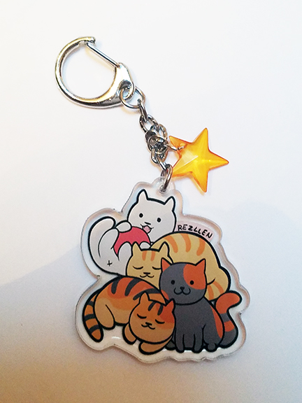 A 2 inch double sided keychain made from sturdy acrylic and a metal chain and lobster claw to make sure it stays in place. Each side of the keychain features a different version of the design. Charm has a subtle glitter effect.