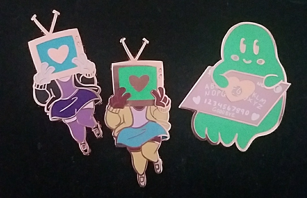 These are 2inch large glow in the dark rose gold pins. The tv head girls are $12 and the ghost is $15 due to being screen printed.