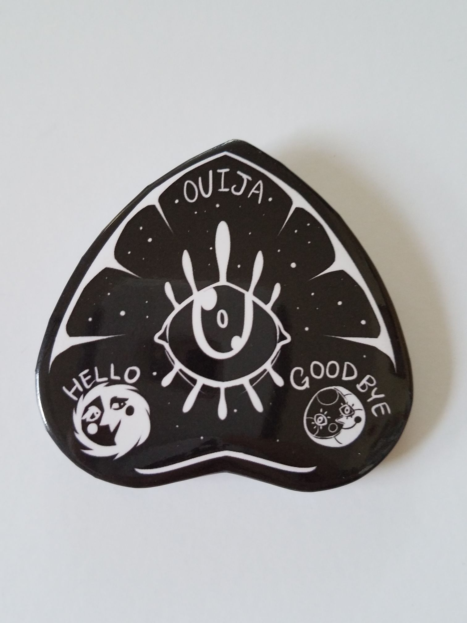 A 2.5 inch button of a oujia board planchette. Spooyk!